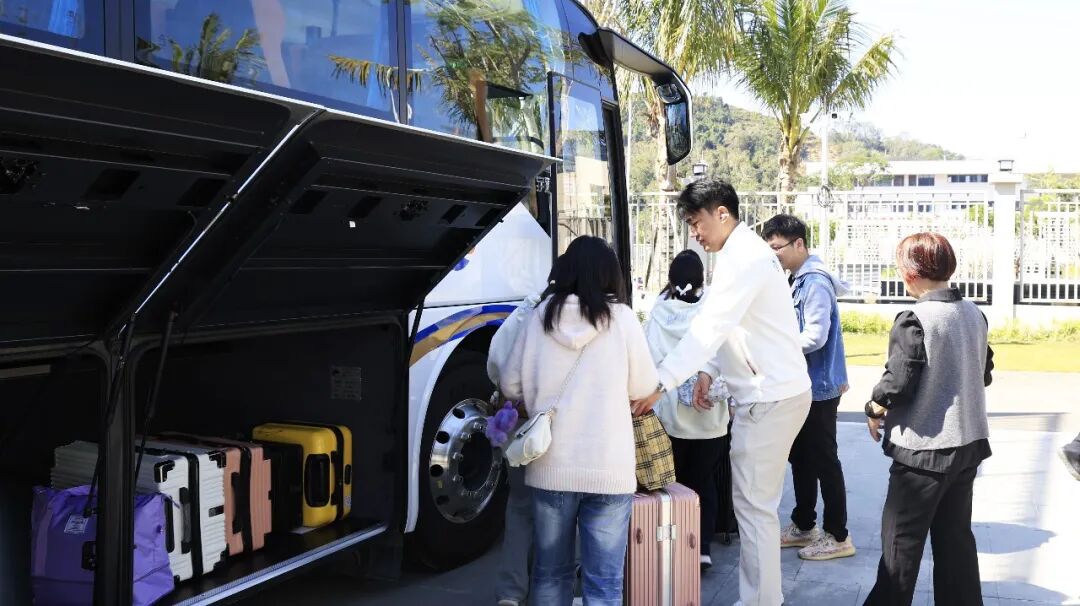 考虑到不少学生需前往机场乘机,携带行李转车不便,张海俊校长亲自部署、协调安排了直达凤凰机场的免费大巴服务。车辆于9日、10日两天集中发车,共计8个班次,覆盖不同时段,尽可能满足学生的航班时间需求,以及同学们通过机场中转三亚动车站的需要。大巴车前,学生工作事务部老师热情协助学生放置行李、引导上车,秩序井然。